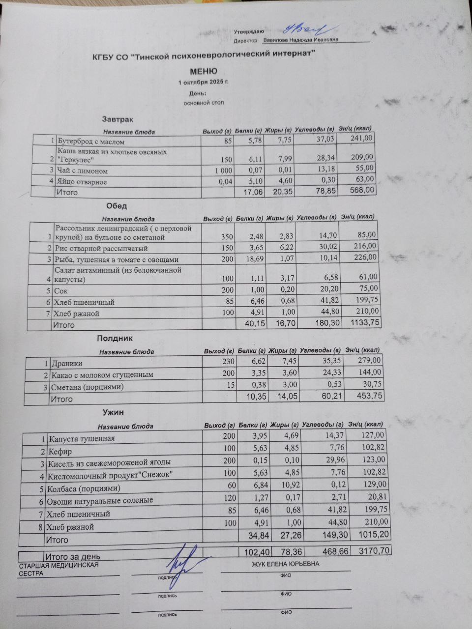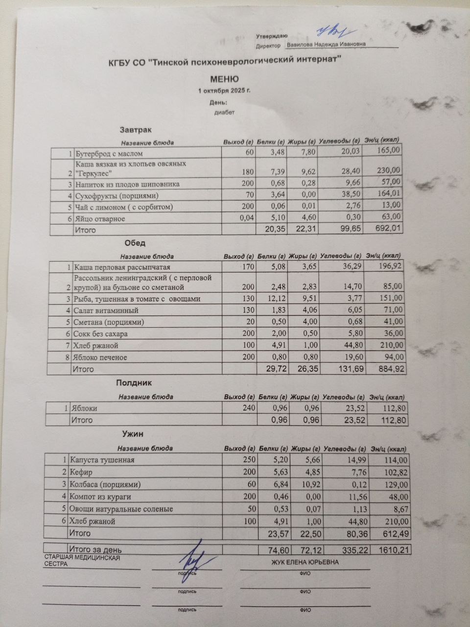 • Питание за 01.10.2025